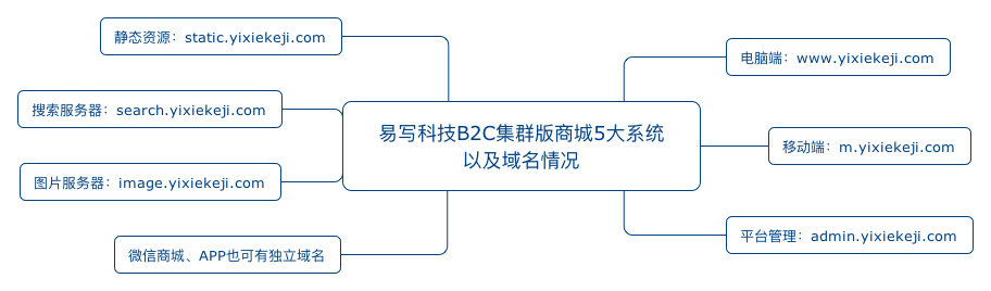 由于电商业务的特殊性与复杂性,电商不适合一台服务器搞定所有的事情,所以易写科技定位中高端,低版本也是集群版,集群版拆分成5个子系统,每一个子系统都是独立部署,每一个子系统都可以做集群,这5个子系统是:1、电脑端;2、Html5商城;3、平台管理系统;4、搜索服务器;5、图片服务器,图片服务器和搜索服务器已经拆分开,所以做水平扩展非常方便。每一个子系统都有独立的域名,如图所示: