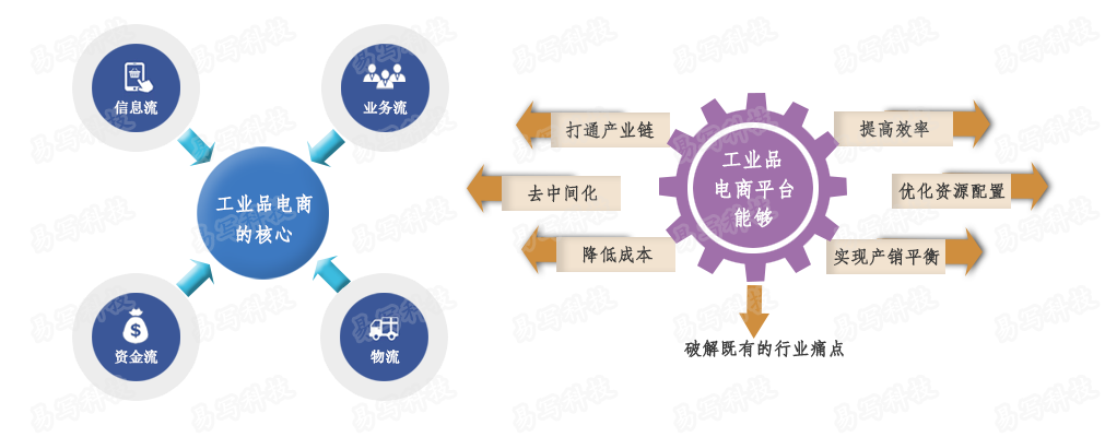 信息流、业务流、资金流、物流为工业品电商的核心组成部分,而工业品电商平台能够打通产业链、提高工作效率、去中间化、降低成本等!